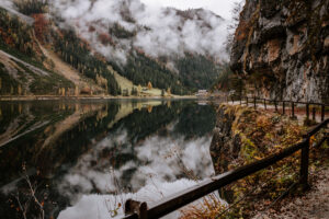 Unsere Wanderung beginnt direkt am Vorderen Gosausee und führt entlang des ersten Sees, ständig mit Blick auf die umliegende Bergkulisse. Wir wandern entlang eines Forstweges, der durch den Wald führt und an einer kleinen Lichtung, der Gosaulacke, sowie zwei Jagdhütten vorbei, bis wir nach 1 1/2 Stunden den Hinteren Gosausee mit der Holzhackerhütte erreichen. Ein wunderschöner Ort zum Rasten. Für Getränke ist ebenfalls gesorgt – diese schwimmen im Wasser und kosten 3 Euro, dann gehört das Getränk dir.