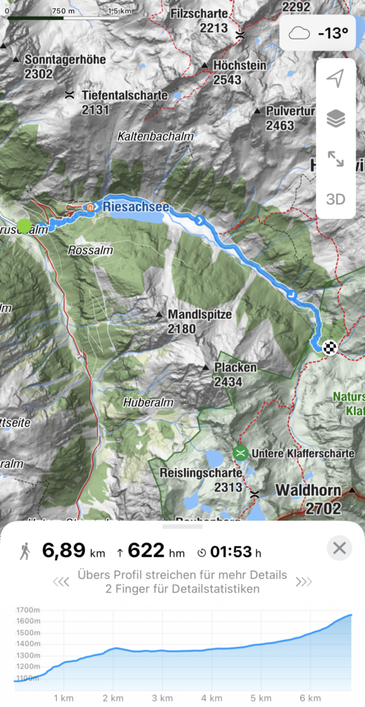 Unsere Tour in den Klafferkessel begann am Parkplatz im Seewigtal. Von hier aus führte uns der gut markierte Wanderweg stetig bergauf, zunächst durch schattige Wälder und später über offene Almflächen. Mit zunehmender Höhe wurde die Landschaft immer alpiner, und die ersten Blicke auf die umliegenden Gipfel begleiteten uns auf dem Weg.