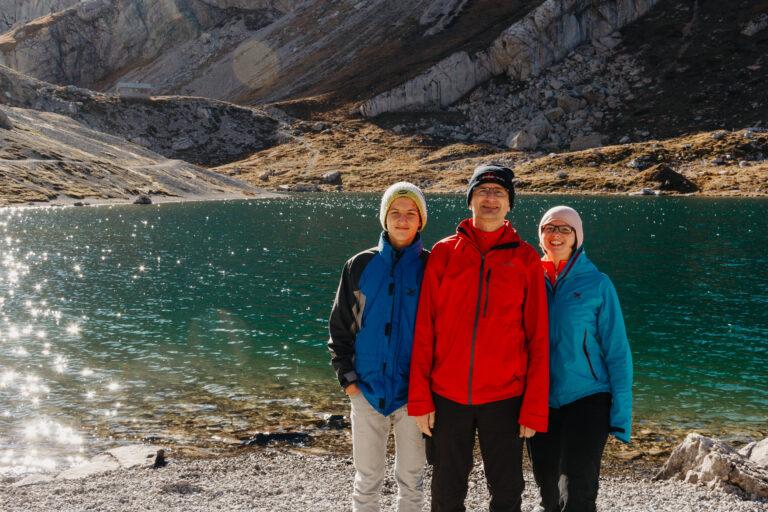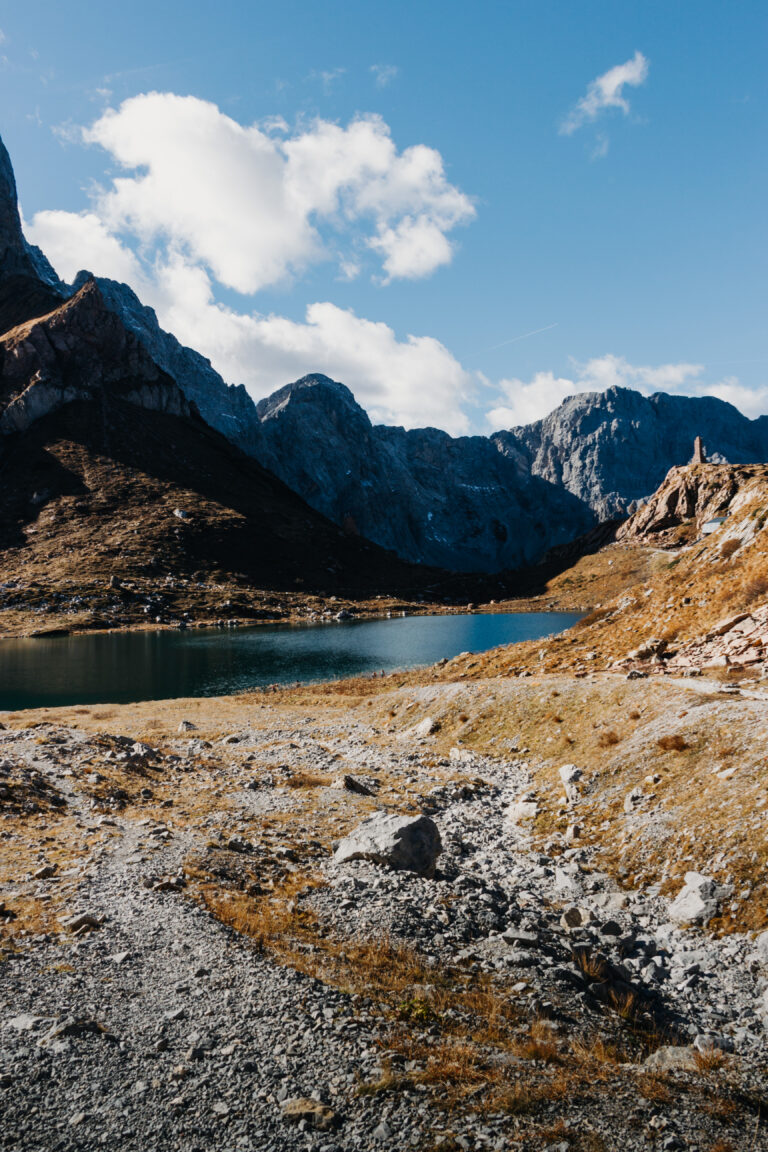 Beim Valentintörl, 2.138 m, ist der höchste Punkt unseres Hüttenanstieges erreicht: Wir sehen den schimmernden Wolayer See umgeben von einer prächtigen Gipfelrunde. Beim Abstieg zum See erscheint die Wolayerseehütte in greifbarer Nähe. Leider hatte die Hütte geschlossen und so blieben wir direkt am See für eine kurze Pause. Jause hatten wir mit.