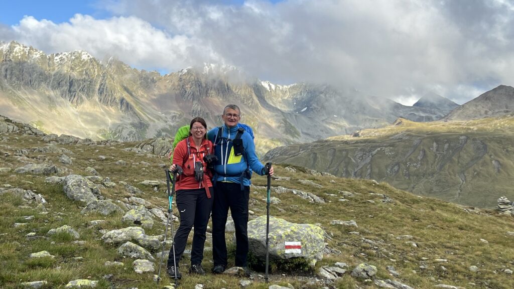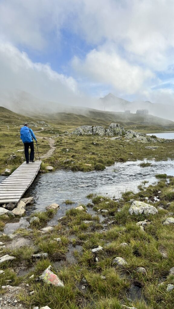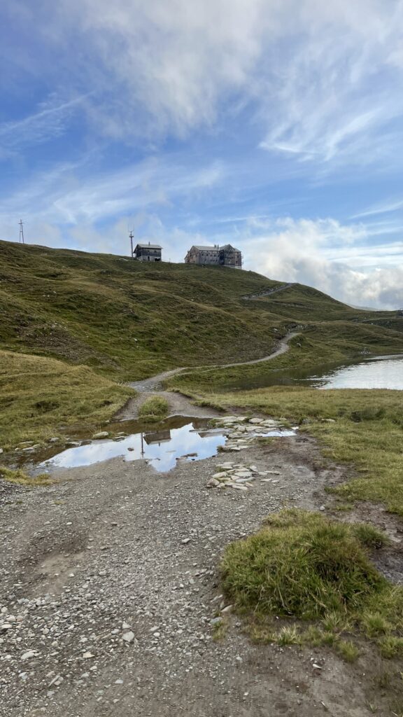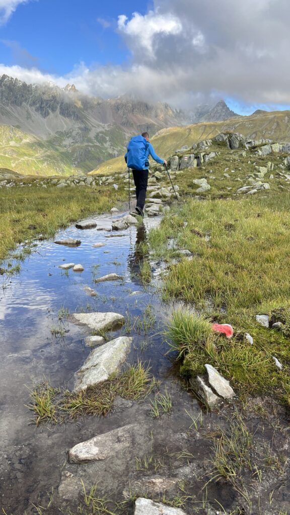 Gemeinsam mit Martina wanderten wir den Schwarzen Weg von der Wormser Hütte zur Neuen Heilbronner Hütte. Wir brauchten dafür 10 Stunden und 30 Minuten. Auf dem Weg gab es mehr als genug Wasser – sowohl von oben als auch von unten. Wir mussten oft über Bäche springen, und die Wanderwege standen teilweise unter Wasser. Dabei begegneten uns viele Wildtiere: Alpensalamander, Steinbock, Gemsen, Murmeltiere, Kröten und sogar ein Fuchs.