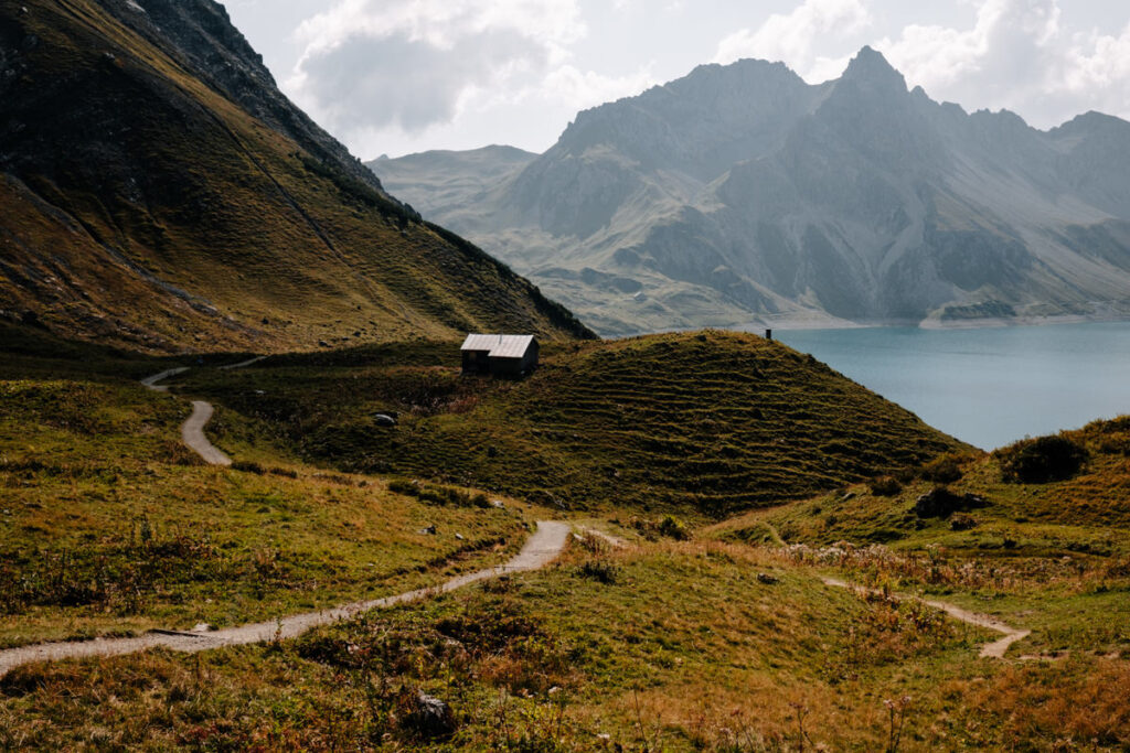 Von der Bergstation geht es einmal rund um den Lünersee. Der Weg beginnt bei der Douglass-Hütte und führt rechts Richtung Schesaplana am Uferweg entlang bis zur Lünersee-Alpe. Von der Alpe geht es dann weiter bis zur Aussichtskanzel hinauf. Danach wieder hinunter zum Staudamm und zur Douglass-Hütte.