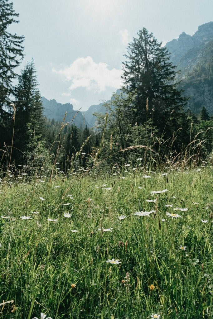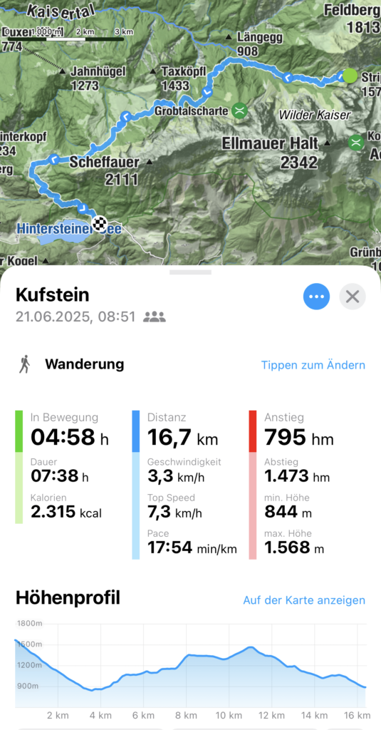 Der Weg führt entlang kleiner Bäche, durch saftige Wiesen und teilweise über schmale Pfade. Trittsicherheit ist besonders bei feuchtem Untergrund empfehlenswert. Nach einem nicht zu unterschätzenden Abstieg von 1.473 Hm erreichten wir schließlich den idyllischen Hintersteiner See (ca. 883 m). Mit dem Bus ging es für uns zurück zum Parkplatz, wo unser Auto auf uns wartete.