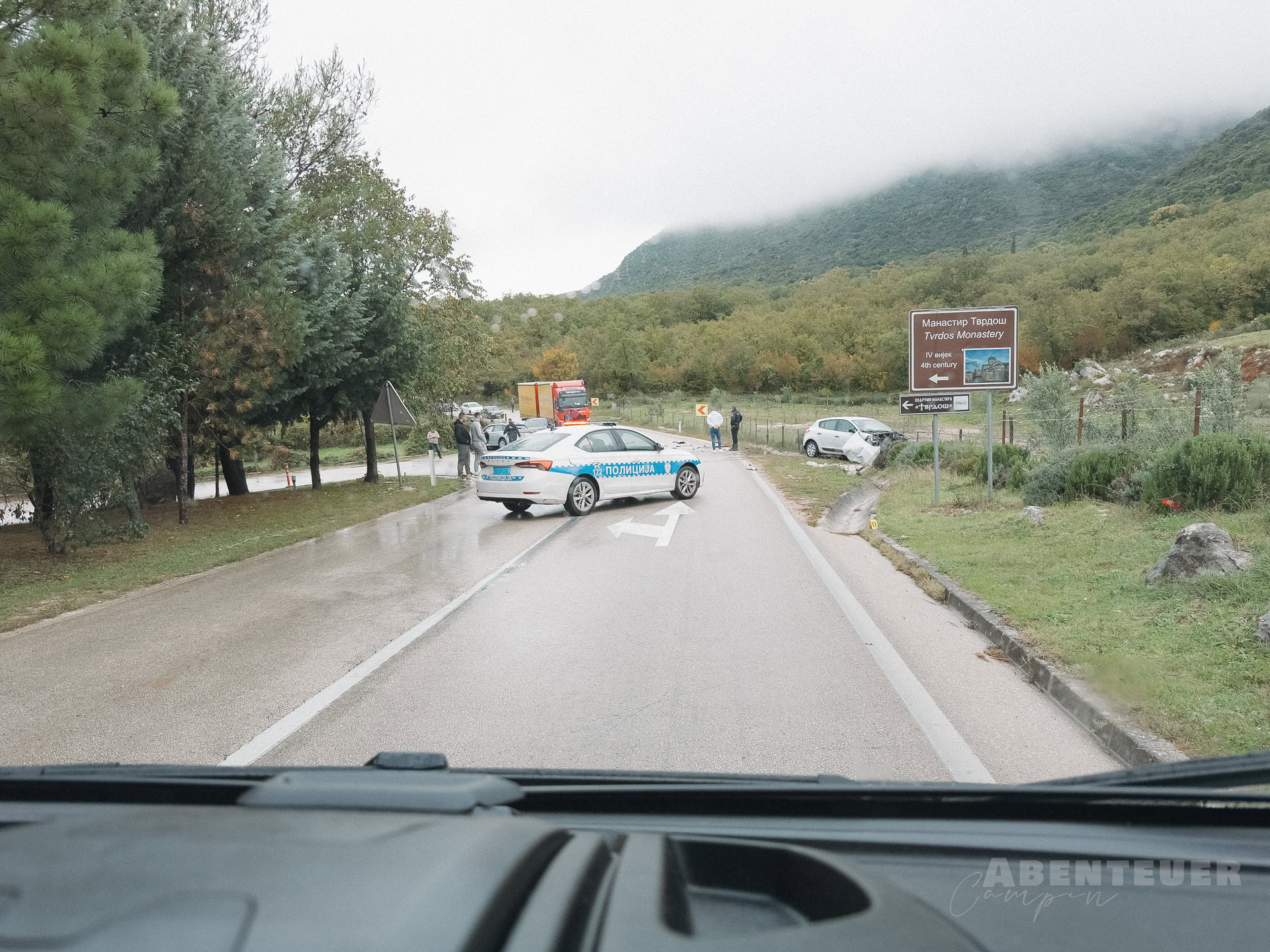 Unsere Route führt uns durch Bosnien, wo wir unerwartet für etwa zwei Stunden in einem Verkehrsstau stehen. Der Grund ist ein Unfall. Interessant ist dabei vor allem, wie hier mit der Spurenlage und den Aufräumarbeiten umgegangen wird. Zum Glück ist nichts Schlimmes passiert – lediglich Blechschaden.