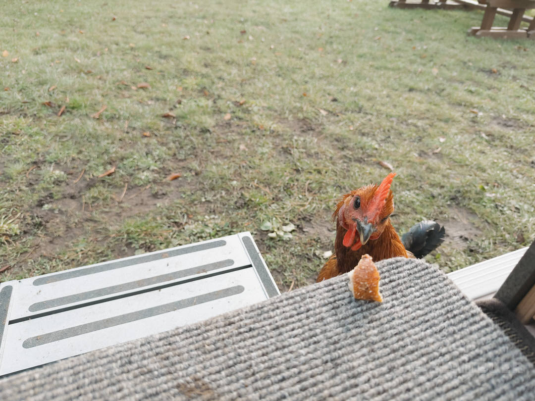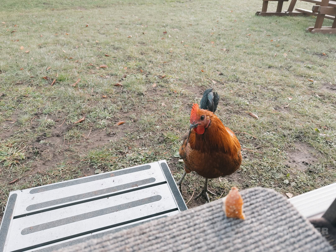 Unser Tag begann auf dem Campingplatz Borje mit einem besonderen Frühstücksgast: ein hungriger Hahn, dem wir etwas Brot gaben. Nach dem Frühstück machten wir uns auf den Weg in Richtung Küste.