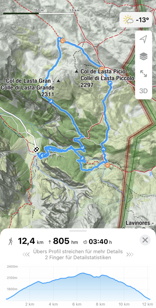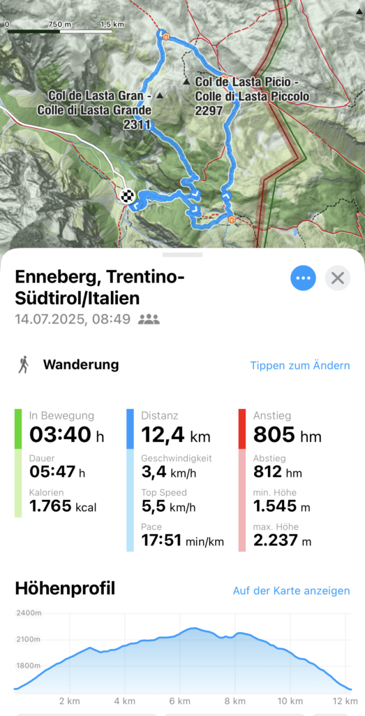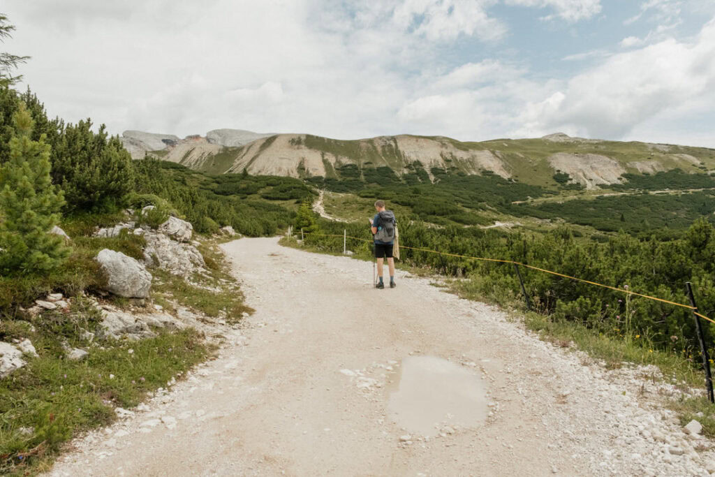 Von dort aus folgten wir dem Weg Nr. 7 hinauf zum Rifugio Fodara Vedla, wo wir uns einen Saft gönnten und eine kleine Pause einlegten. Anschließend setzten wir unseren Weg auf Weg Nr. 7 fort, vorbei an der Sennes Hütte, bis zur Munt de Sennes, wo wir zu Mittag aßen. Danach änderte sich das Wetter und es begann zu regnen – weshalb es ab diesem Punkt leider keine weiteren Bilder mehr gibt.