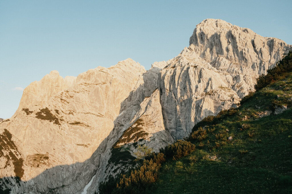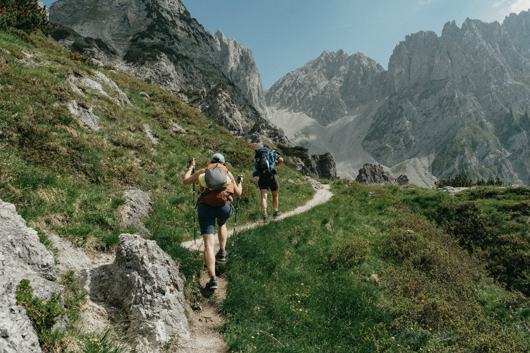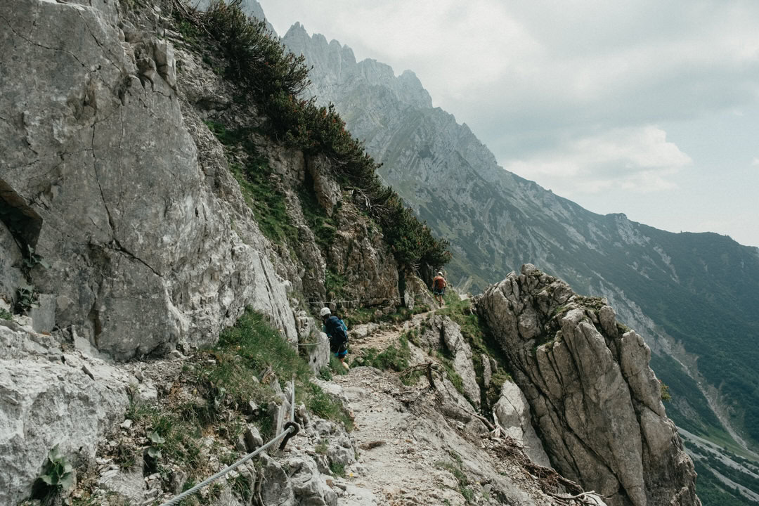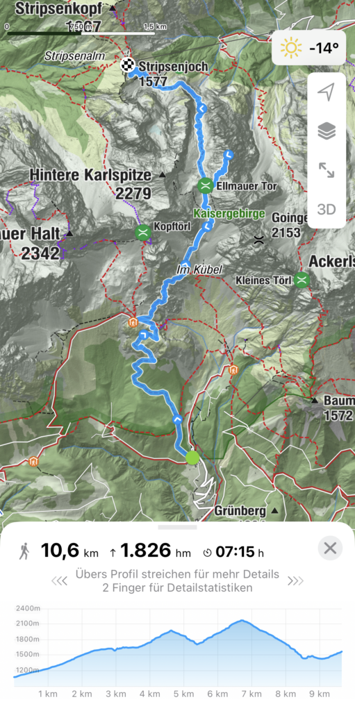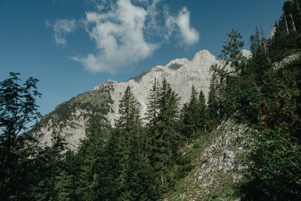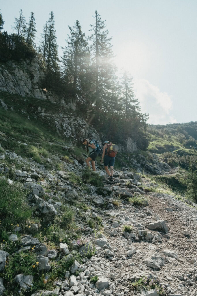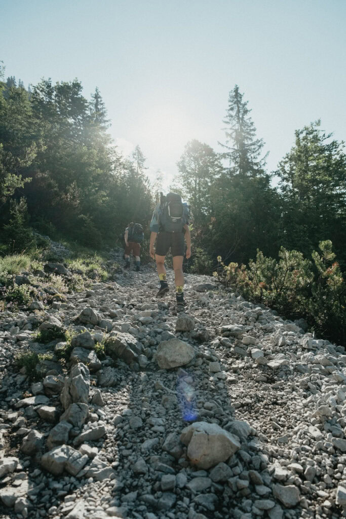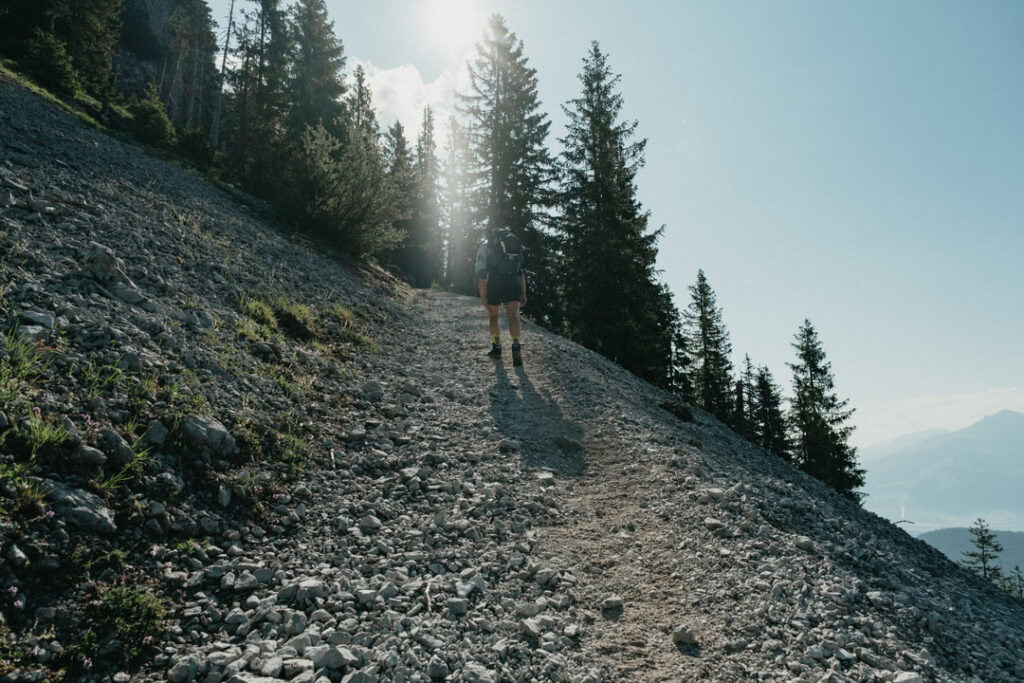 Anschließend führte uns der Weg rund um den Sockel der Fleischbank und weiter auf dem Eggersteig, der rechts vom Pfad abzweigt. Vorbei an felsigen Abschnitten und schattigen Waldpassagen ging es langsam bergab. Schließlich erreichten wir den letzten Abschnitt: einen gemütlichen Abstieg in östlicher Richtung, der uns direkt zum Stripsenjochhaus brachte – ein perfekter Ort, um die Beine auszuruhen, den Blick über das Kaisergebirge zu genießen und den Tag ausklingen zu lassen.