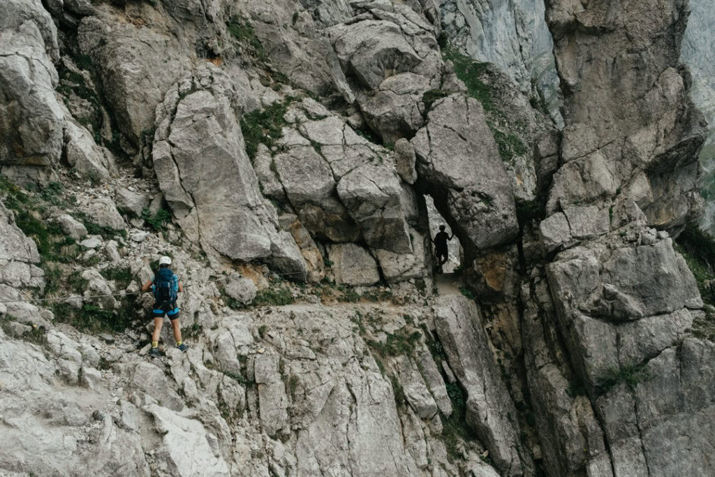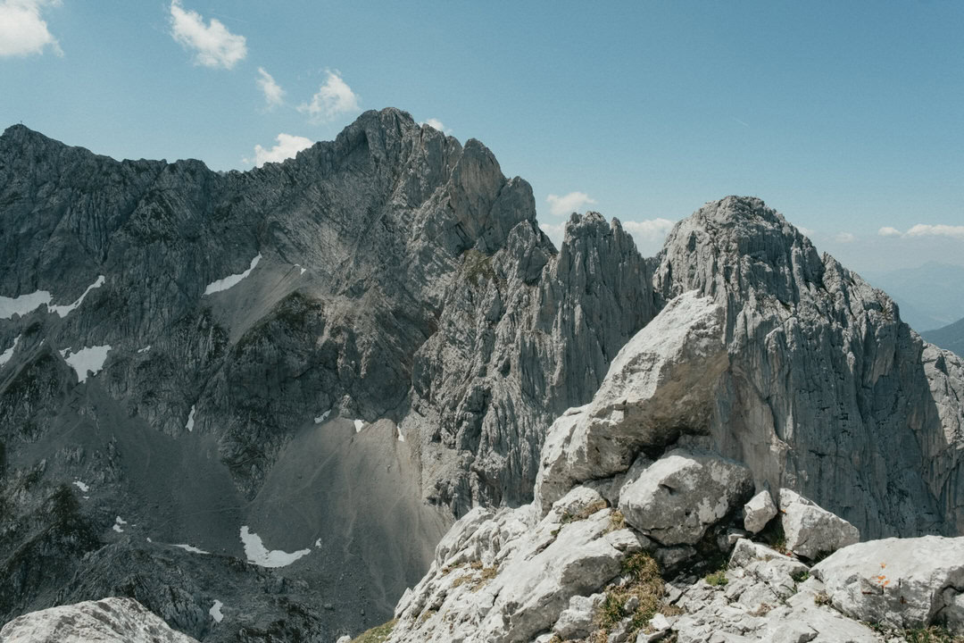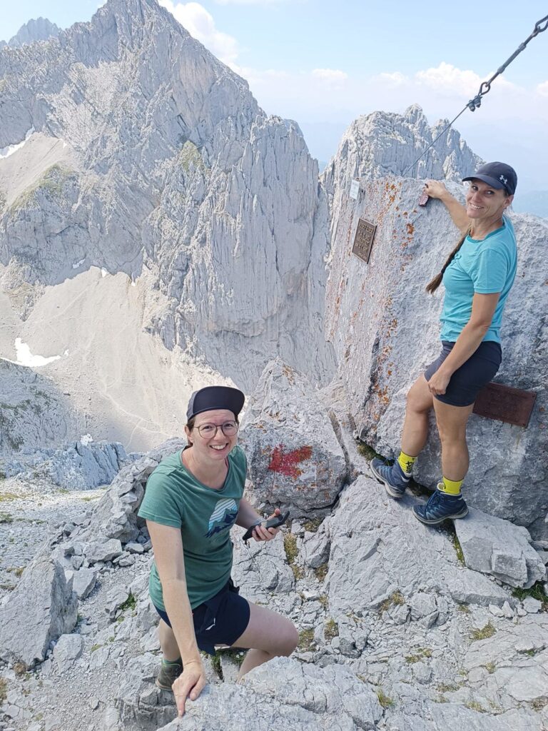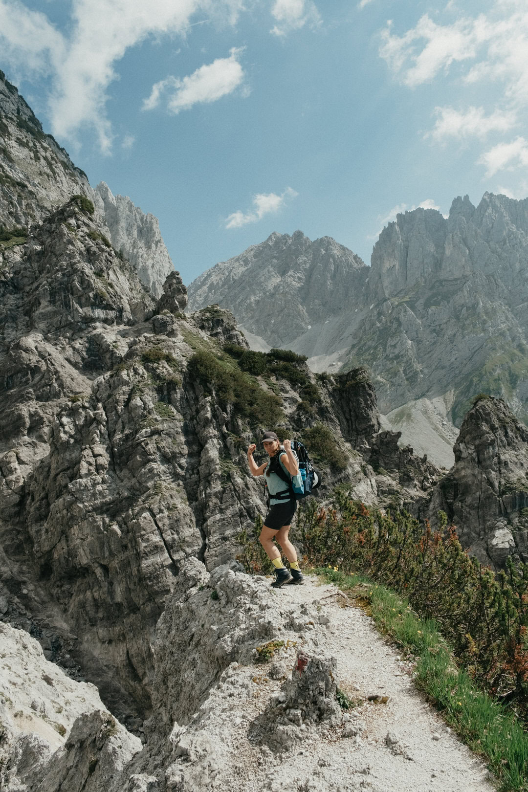 Der Weg schlängelt sich durch spektakuläre Felsformationen, vorbei an steilen Wänden und windgepeitschten Graten. Zwischendurch bieten sich immer wieder fantastische Ausblicke auf das Kaisergebirge und das Tal unter uns – ein Panorama, das jeden Schritt belohnt. Nach etwa 45 Minuten bis 1 Stunde erreicht man schließlich das Elmauertor, ein natürlicher Felstunnel und eine Art „Tor“ in eine weitere Gebirgswelt. Hier machten wir eine kleine Verschnaufpause, genossen die Aussicht und fühlten uns ein bisschen wie auf einem Bergabenteuerfilm.