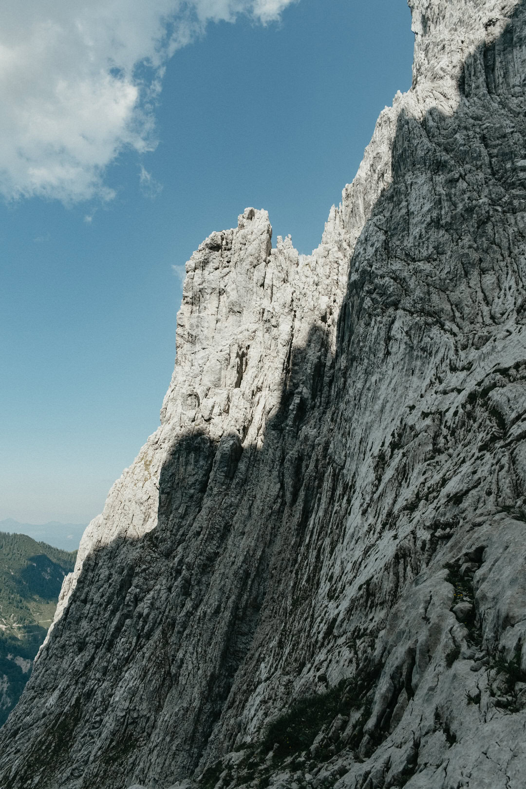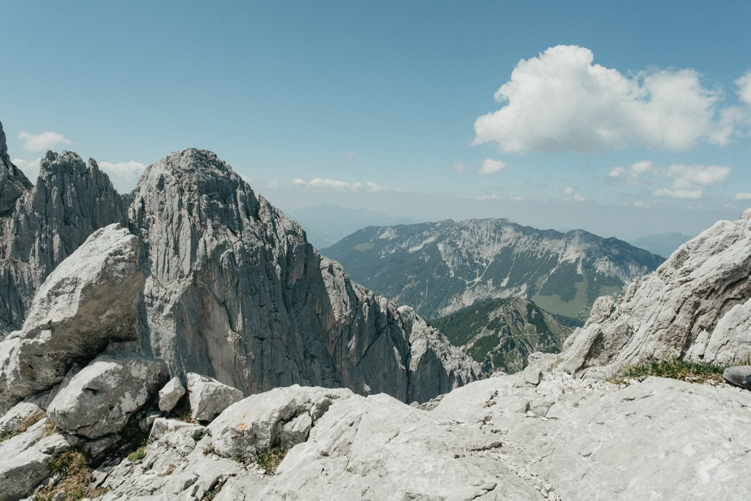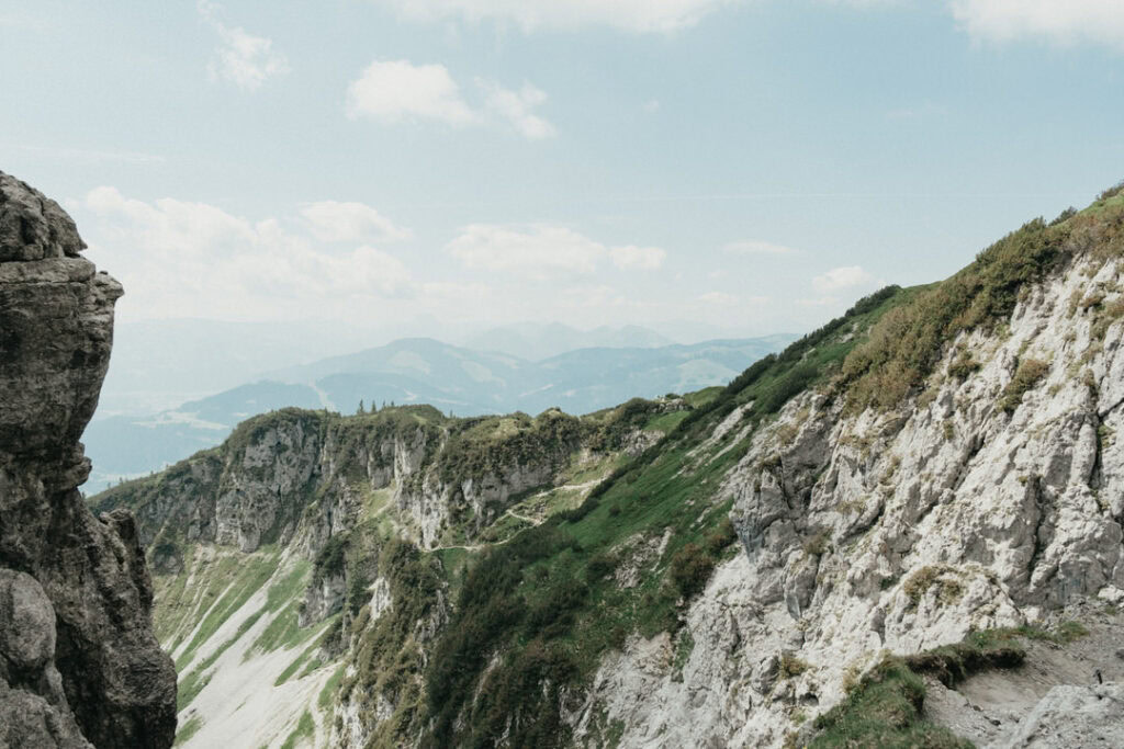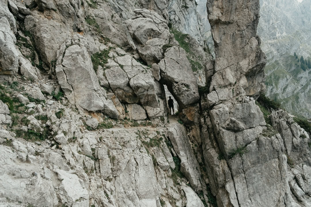Der Weg schlängelt sich durch spektakuläre Felsformationen, vorbei an steilen Wänden und windgepeitschten Graten. Zwischendurch bieten sich immer wieder fantastische Ausblicke auf das Kaisergebirge und das Tal unter uns – ein Panorama, das jeden Schritt belohnt. Nach etwa 45 Minuten bis 1 Stunde erreicht man schließlich das Elmauertor, ein natürlicher Felstunnel und eine Art „Tor“ in eine weitere Gebirgswelt. Hier machten wir eine kleine Verschnaufpause, genossen die Aussicht und fühlten uns ein bisschen wie auf einem Bergabenteuerfilm.