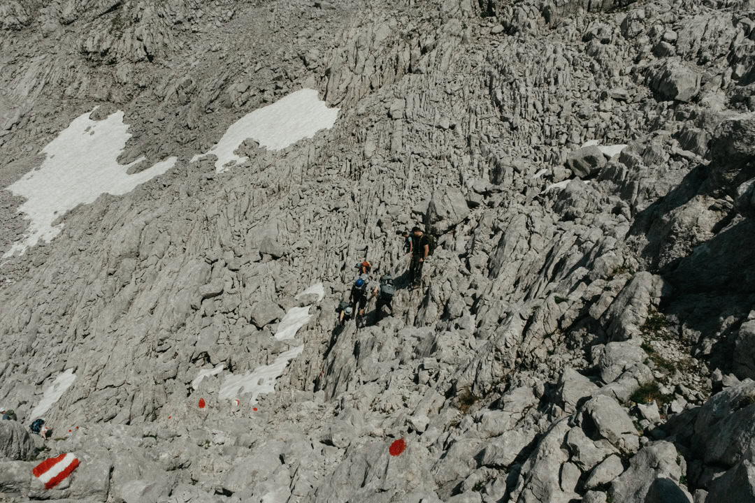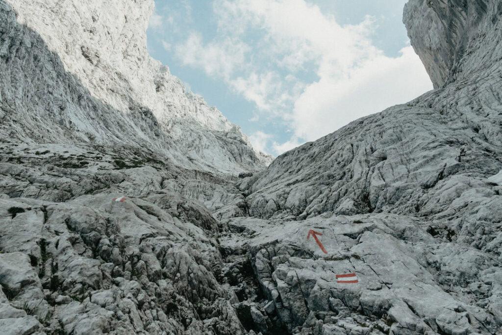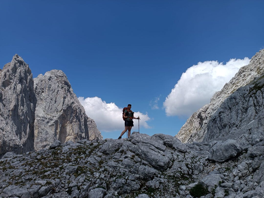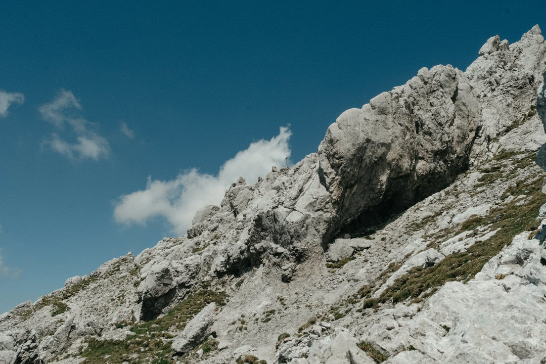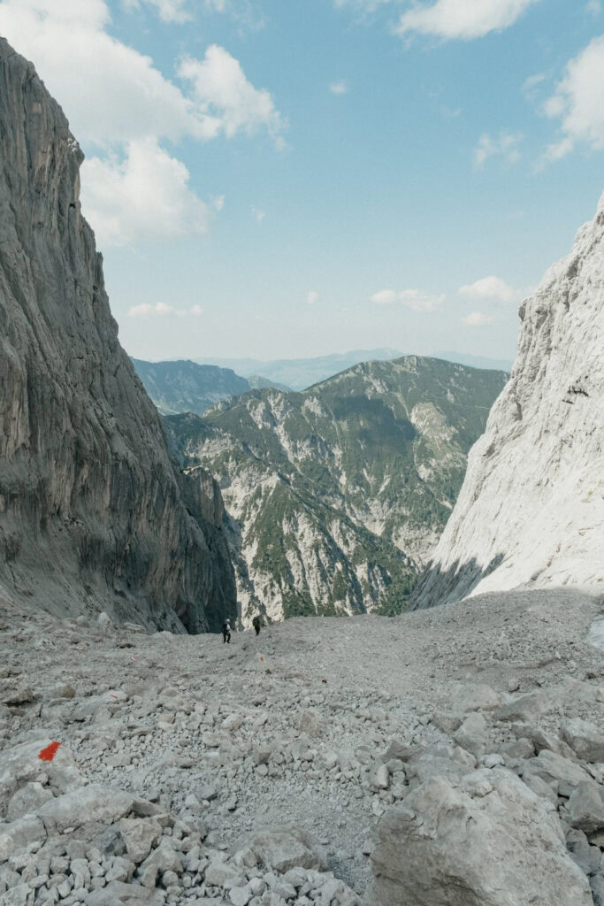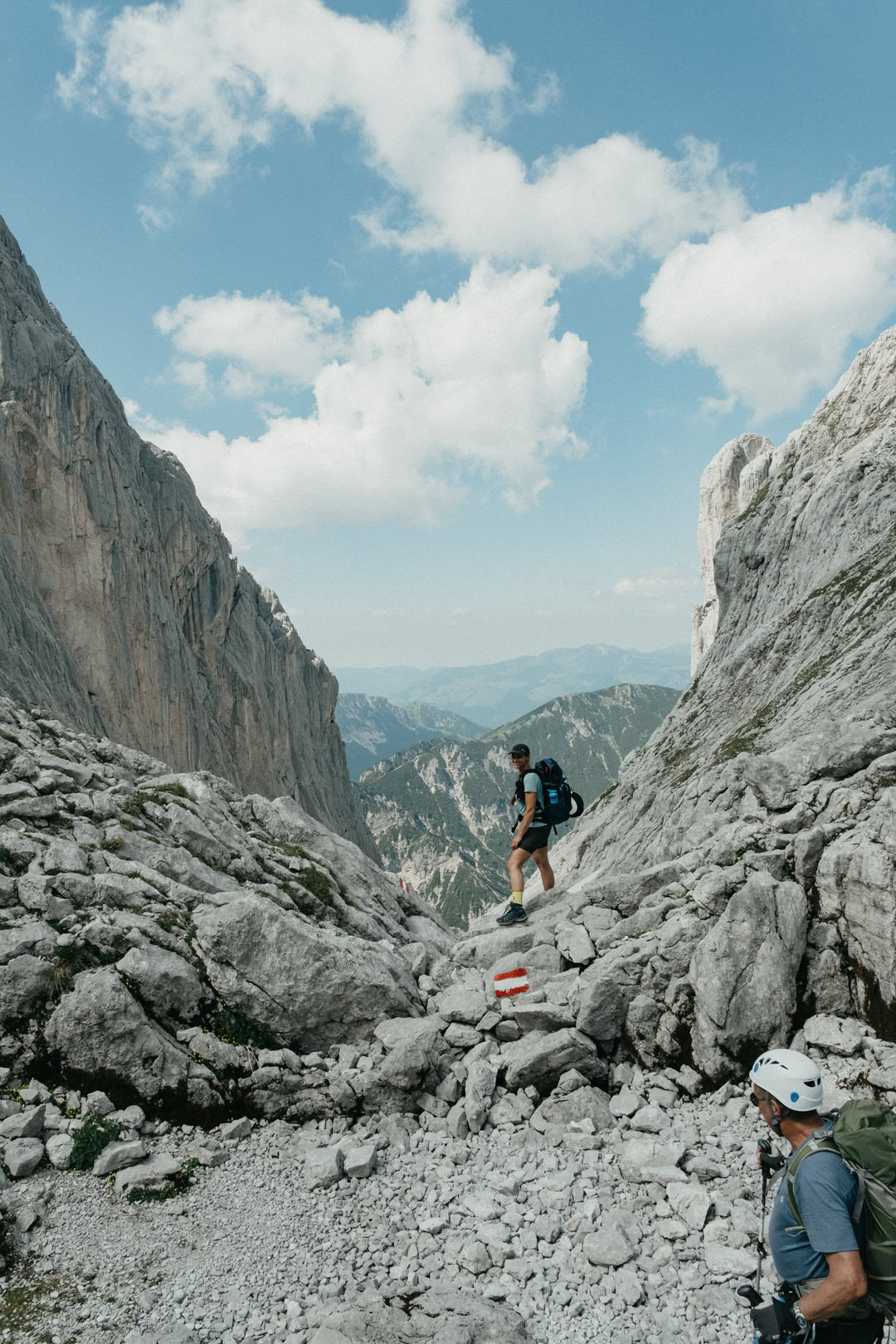 Unsere Wanderung startete am Ellmauer Tor, dem höchsten Punkt unserer Tour. Von hier aus hielten wir uns zunächst östlich und stiegen dann nordöstlich über Geröll und relativ einfache Schrofen ab. Eine kurze, drahtseilgesicherte Rinne und einige Felsstufen führten uns weiter, bevor wir wieder auf den gut markierten Weg trafen, der uns sicher hinunter zur Steinernen Rinne brachte – eine eindrucksvolle Passage zwischen Predigstuhl und Fleischbank, die teilweise mit Sicherungen ausgestattet ist.