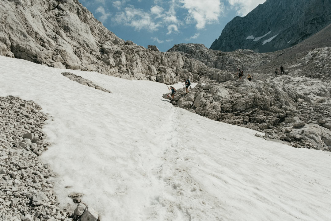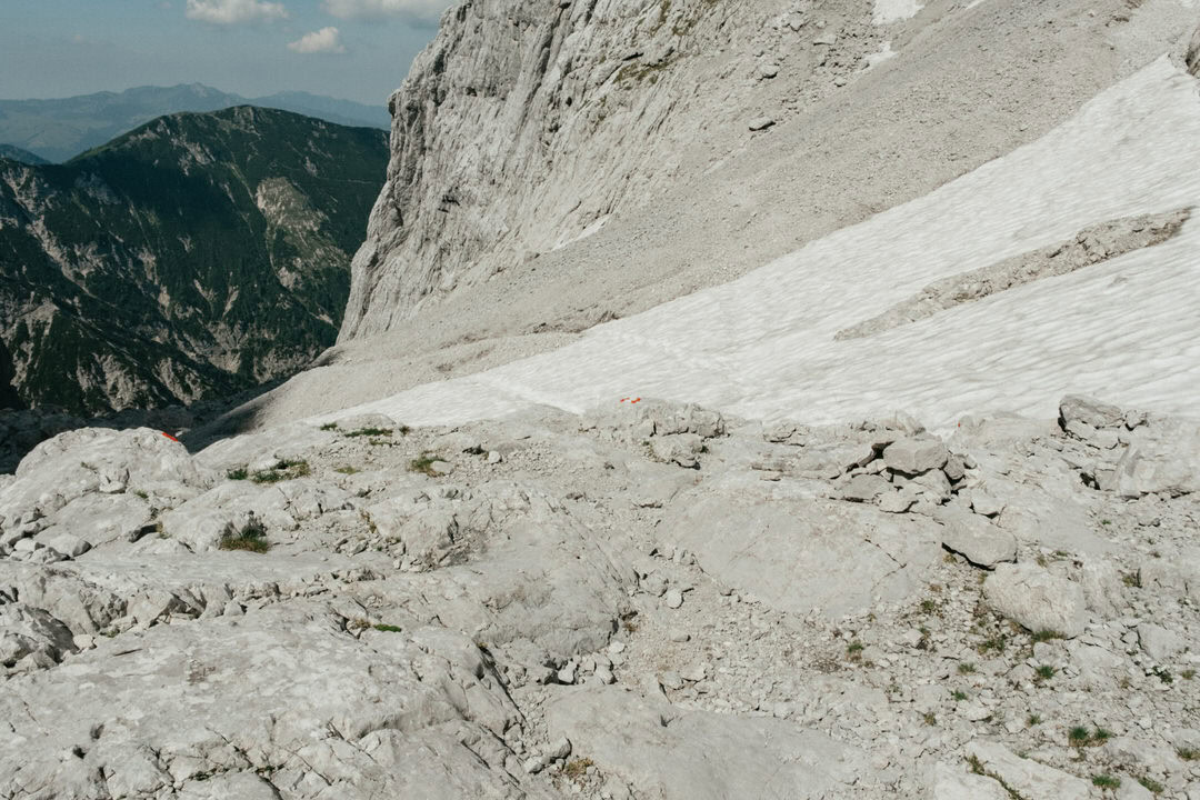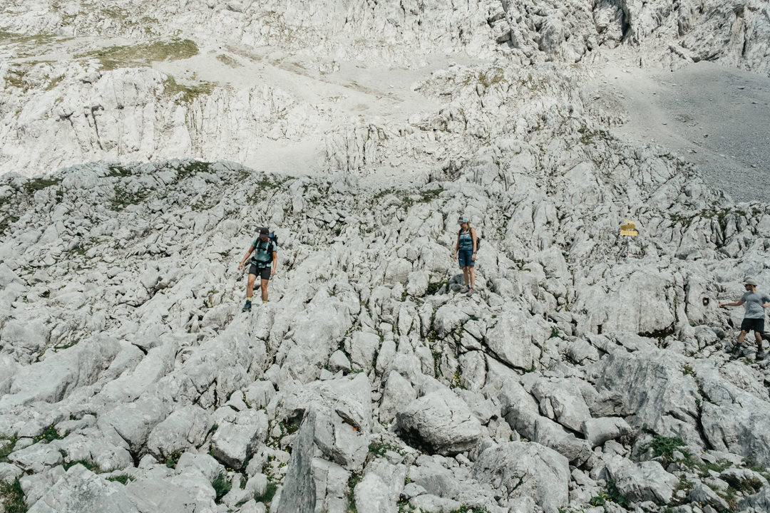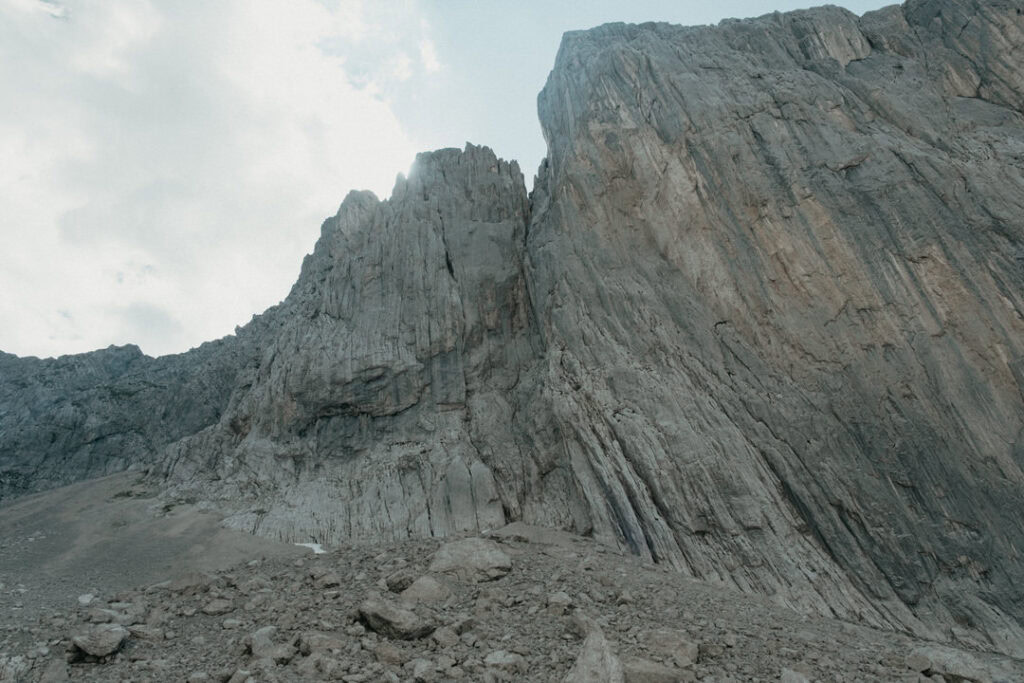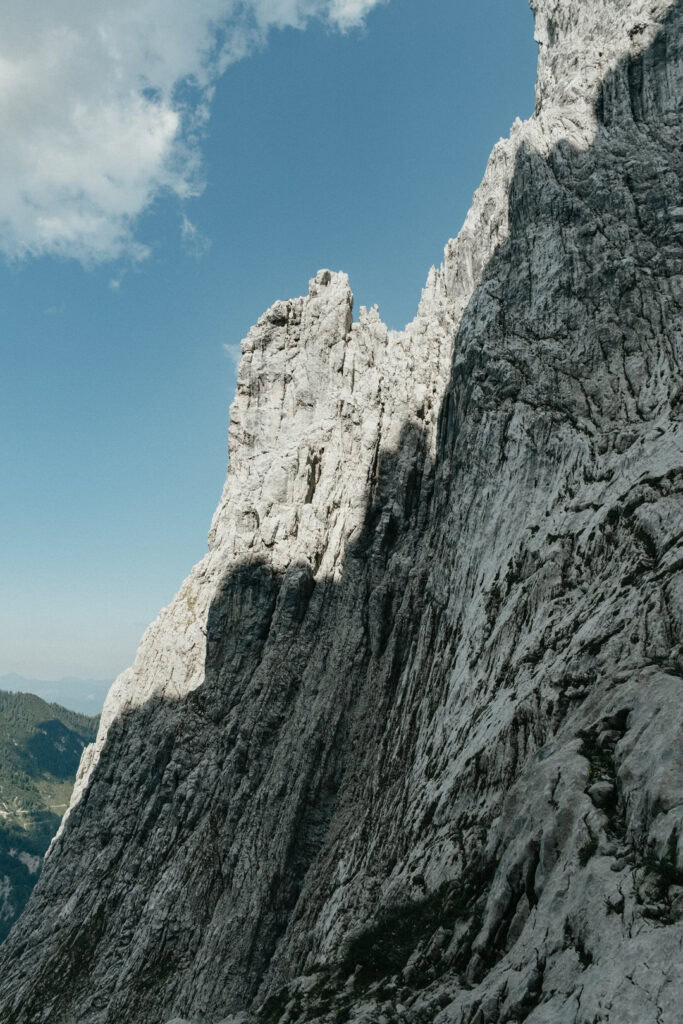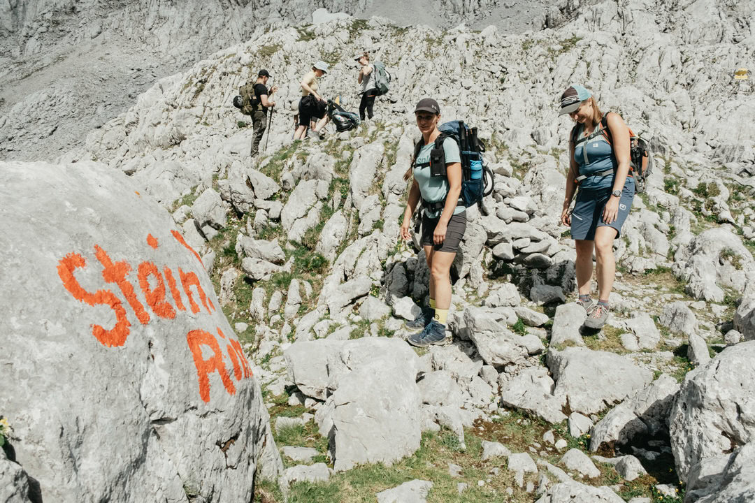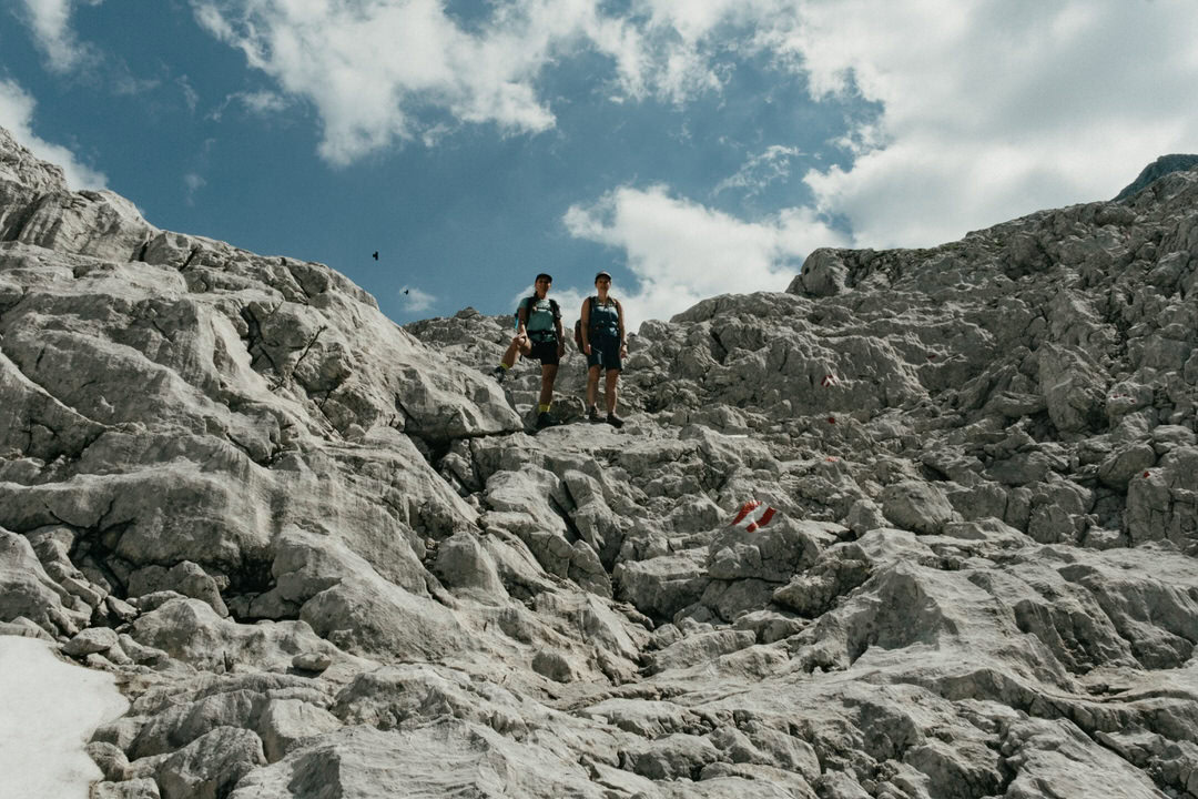 Unsere Wanderung startete am Ellmauer Tor, dem höchsten Punkt unserer Tour. Von hier aus hielten wir uns zunächst östlich und stiegen dann nordöstlich über Geröll und relativ einfache Schrofen ab. Eine kurze, drahtseilgesicherte Rinne und einige Felsstufen führten uns weiter, bevor wir wieder auf den gut markierten Weg trafen, der uns sicher hinunter zur Steinernen Rinne brachte – eine eindrucksvolle Passage zwischen Predigstuhl und Fleischbank, die teilweise mit Sicherungen ausgestattet ist.