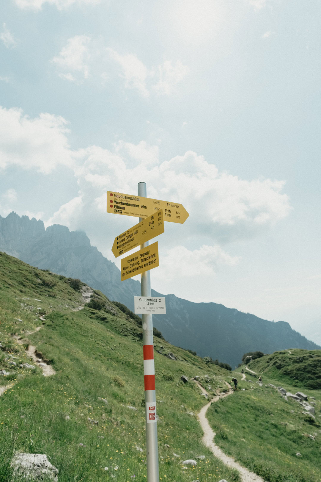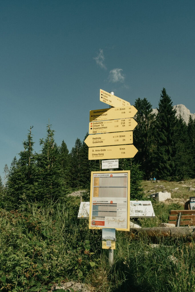 Vom Wanderbus oder Parkplatz kommend startet man an der Wochenbrunner Alm (1.080 m). Von hier aus folgt man dem gut ausgeschilderten Gruttensteig in Richtung Gruttenhütte. Der Weg führt zunächst über breite Wanderpfade durch Almwiesen, vorbei an kleinen Bächen und traditionellen Almhütten. Nach etwa 30–40 Minuten erreicht man den Beginn des etwas steileren Anstiegs, der durch den Wald und über Felsenpartien zur Hütte führt. Unterwegs hat man immer wieder schöne Blicke auf die umliegenden Gipfel des Kaisergebirges.