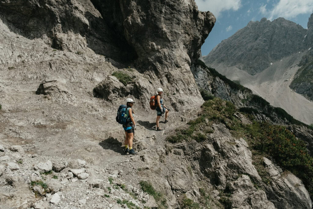 Frisch gestärkt von der Pause an der Gruttenhütte starteten wir unseren Aufstieg zum Elmauertor – und zwar über den bekannten Klettersteig A/B „Jubiläumssteig“. Gleich zu Beginn geht es über felsige Passagen, die Trittsicherheit erfordern, aber mit gut gesicherten Stahlseilen und Tritten ausgestattet sind. Schon nach den ersten Metern spürt man das kleine Abenteuer, das vor einem liegt.